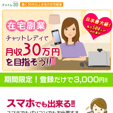 | 時給 2400円~ / 週払いOK / 28~39歳の方限定 ウェブカメラ無料貸し出し有り。登録だけで3000円ボーナス。 公式サイトを見る |